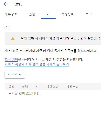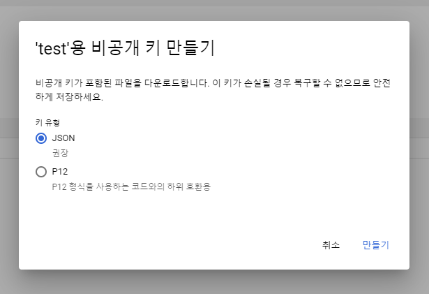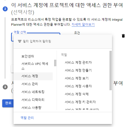 6. 구글 클라우드 콘솔 에서 서비스 계정을 만들고, 키 파일 생성해서 받는다. 순서는 아래와 같다.