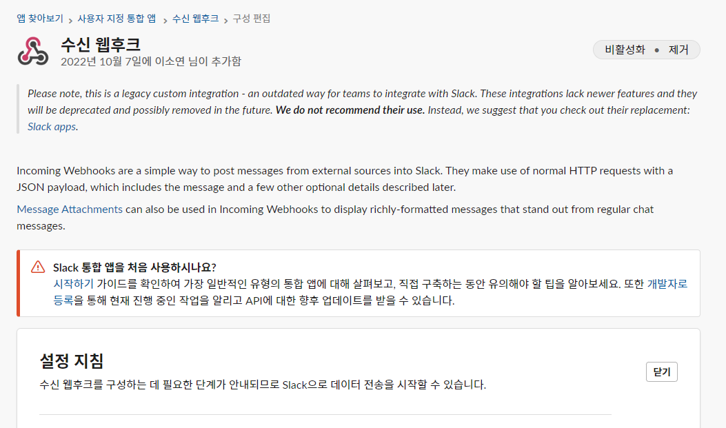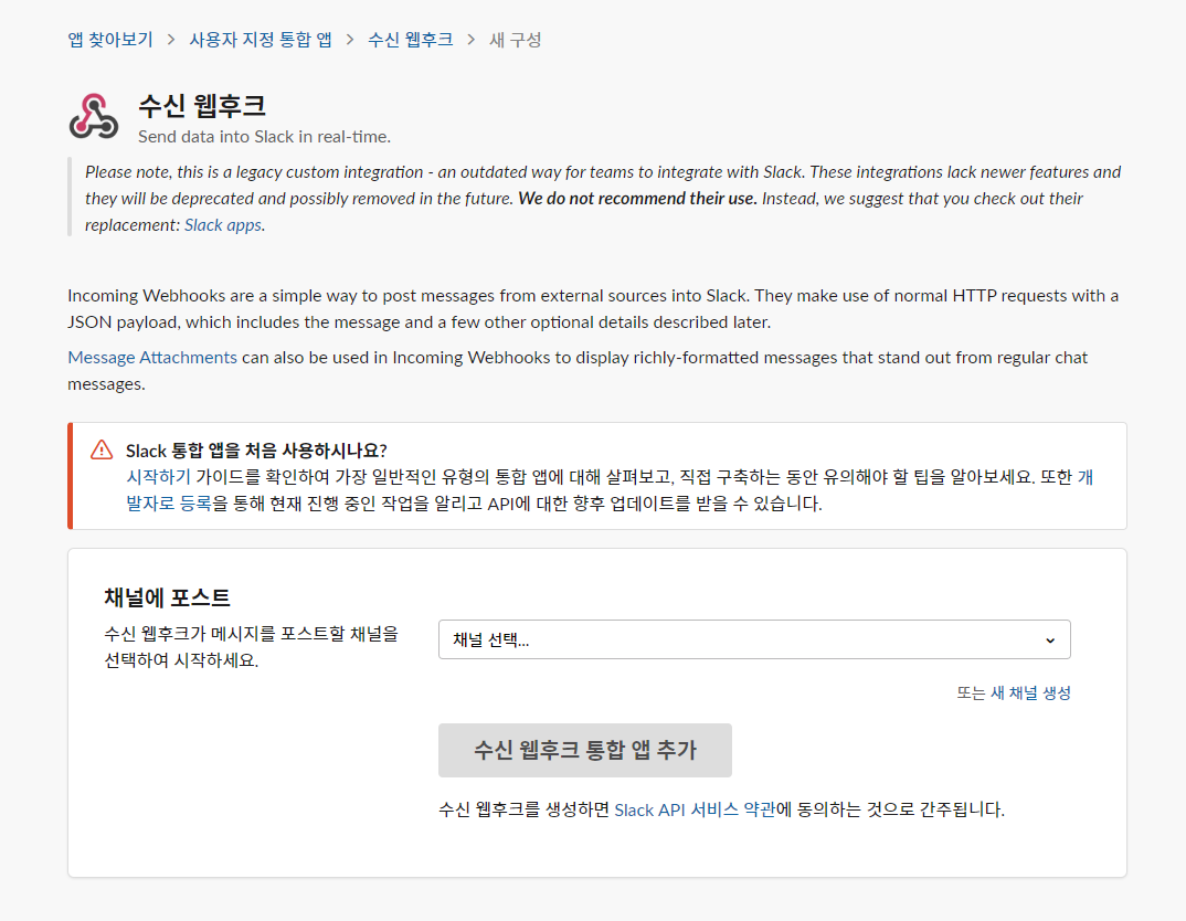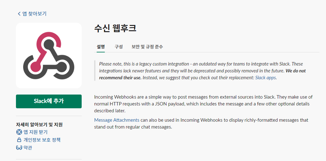 요렇게 뜰것임. 쟤를 slack에 추가해줍시다.